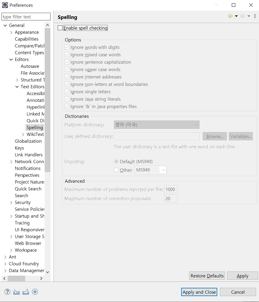 General -> Editors -> Text Editors -> Spelling (스펠링체크 해제)