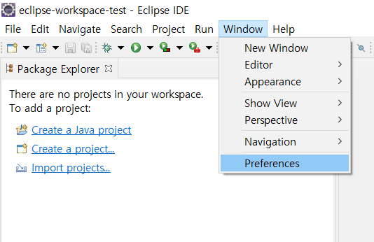 이클립스 환경설정을 위해 Window - Preferences 를 클릭합니다.