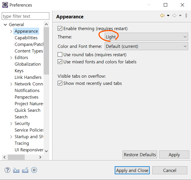 General -> Appearance -> Theme 라이트모드 , 다크모드 설정 가능합니다 저는 다크모드가 익숙해서 쓰고있습니다.
