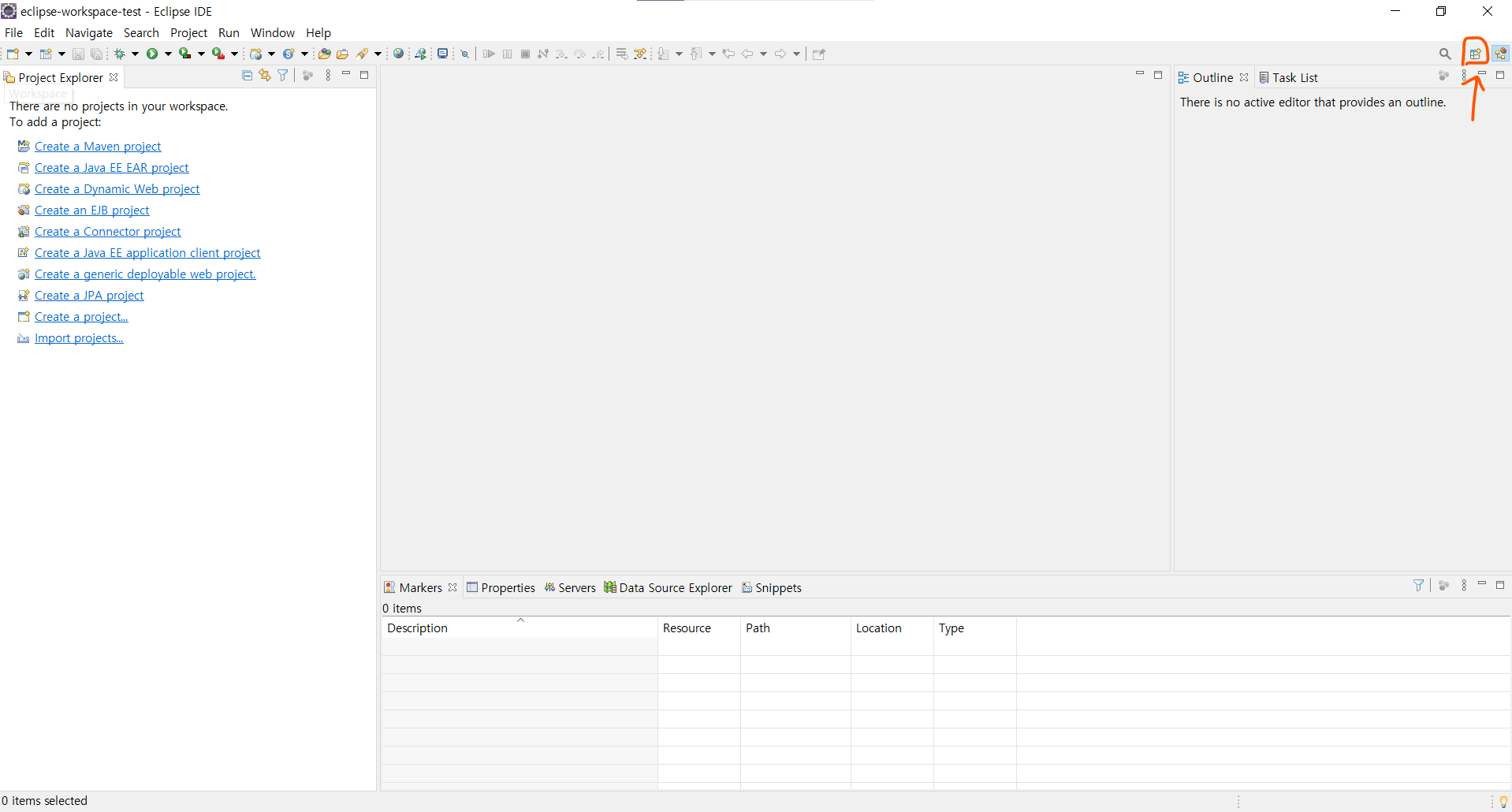 welcome 창을 끄신뒤에 우상단에 Open Perspective 버튼을 클릭해주세요