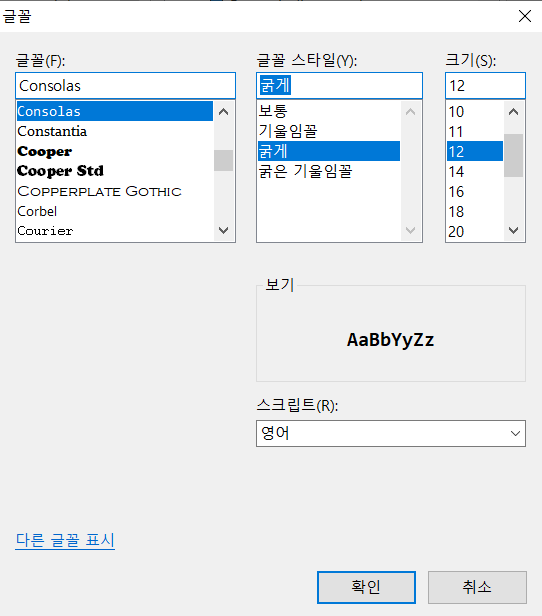 취향에 맞게 선택하시면 됩니다. 저는 영어는 Consolas 가 제일 맘에 들었습니다.