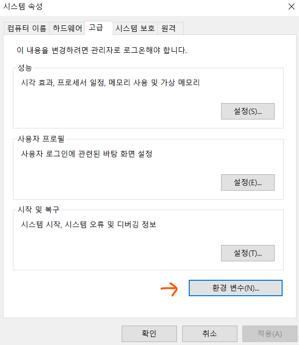 또는 이 경로를 이용하셔도 됩니다. -> 내PC - 속성 - 고급시스템설정 - 고급 - 환경변수